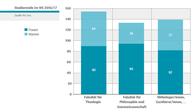 Insgesamt studieren an der KU Linz im Studienjahr 2016/17 426 Personen – knapp zwei Drittel davon sind Frauen: